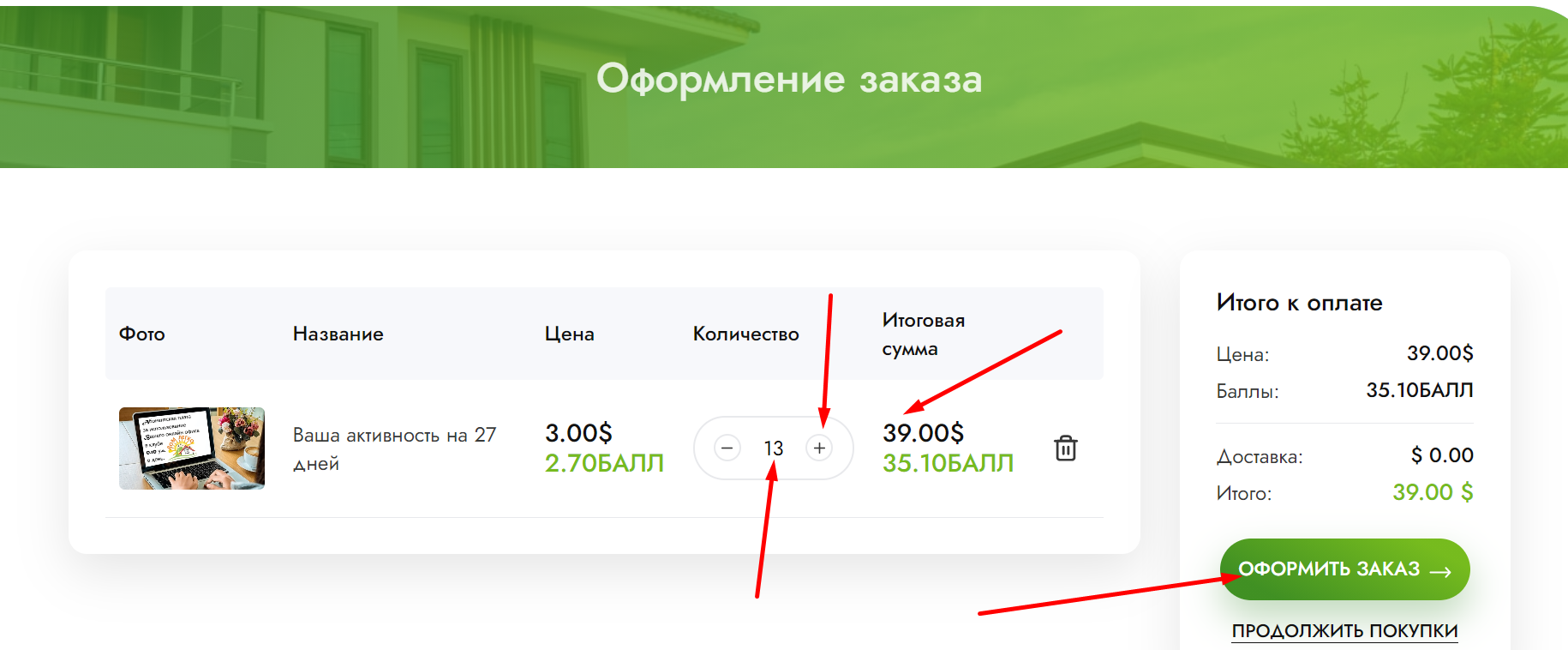 В корзине, нажимая на плюсик, необходимо чтобы количество товара получилось 13 и общая сумма к оплате 39 $, нажимаете “оформить заказ”